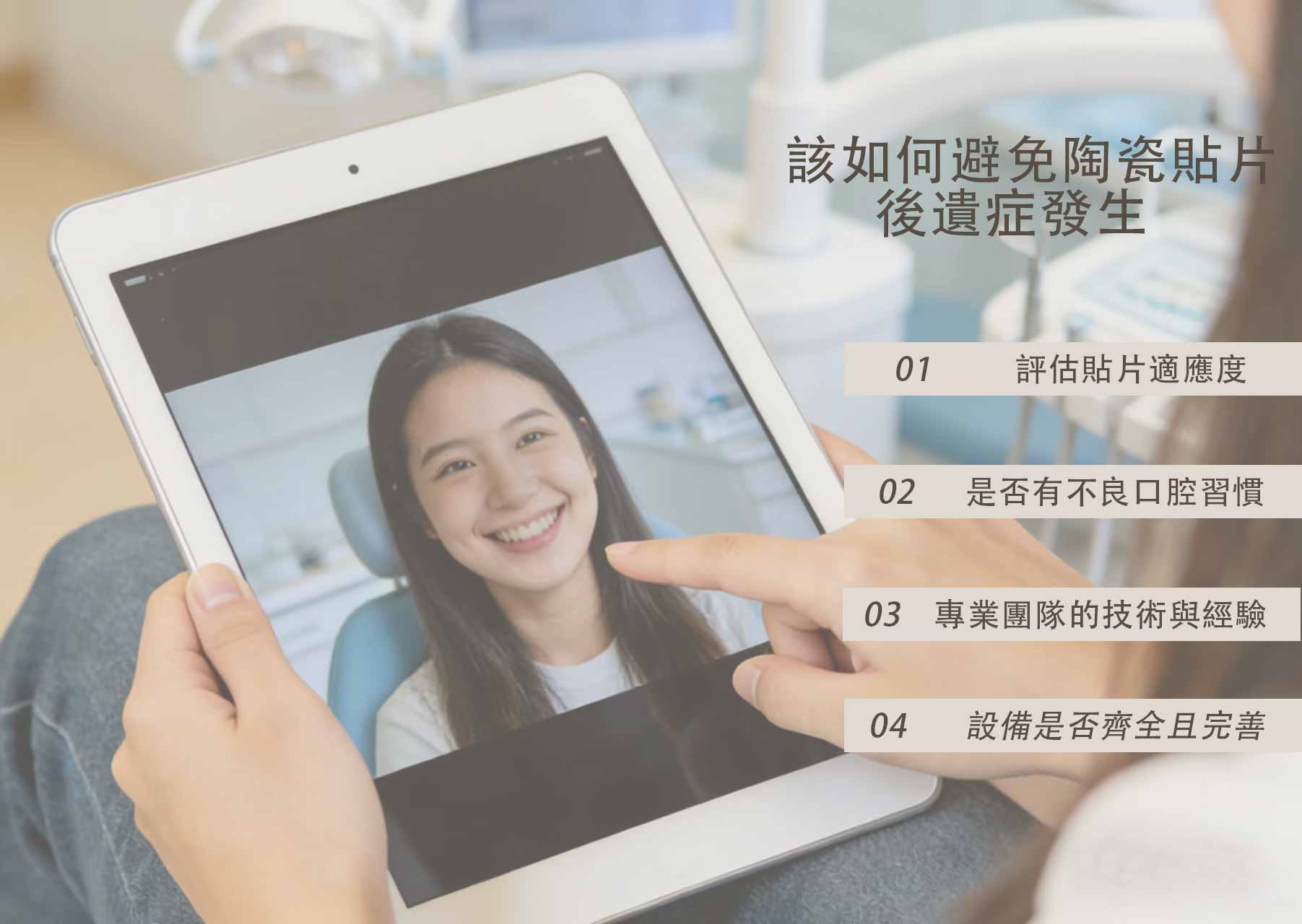 其實,瓷牙貼片帶來的亮白笑容,確實能讓人自信滿滿,但在追求美觀的同時,我們也需要了解如何降低風險,避免做完後感到後悔。只要掌握以下4個重點,就能讓瓷牙貼片持久又美觀!